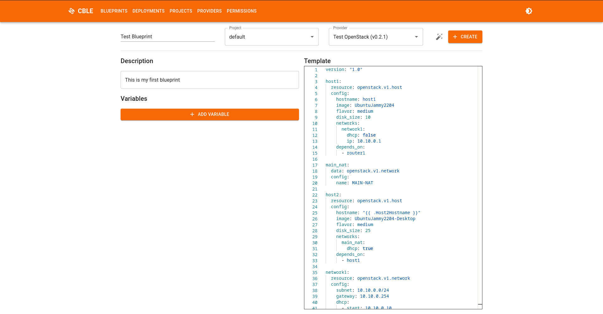 Blueprints will be specific to the provider you've selected. Please visit the provider's repository to find example templates that can be used with your provider.